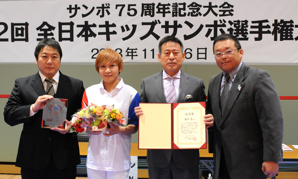 また、過去世界選手権銀メダル獲得などサンボでも実績を残し、総合格闘技において もパウンド・フォー・パウンド最強の称号を得て、先日現役を引退した藤井惠氏(日本 ジュニアサンボ連盟理事)に対して、一般社団法人日本サンボ連盟と一般社団法人日本 ジュニアサンボ連盟より、功労賞が贈られました。